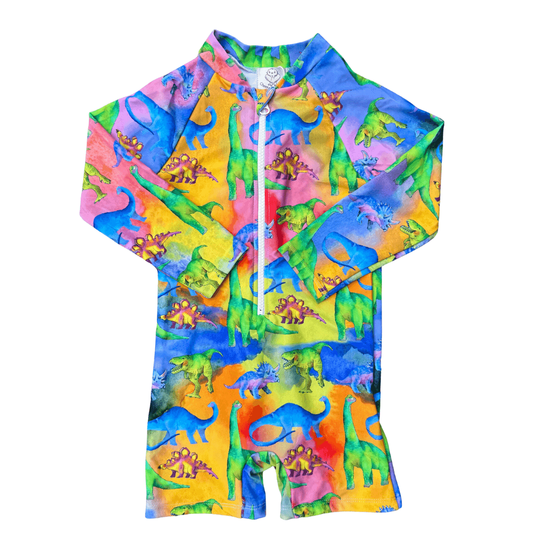 Featured here in our best selling Unisex Long Sleeve Zip Swimmers, our customer favourite vintage Rainbow-saurus print is the perfect swimsuit for boys and girls alike!