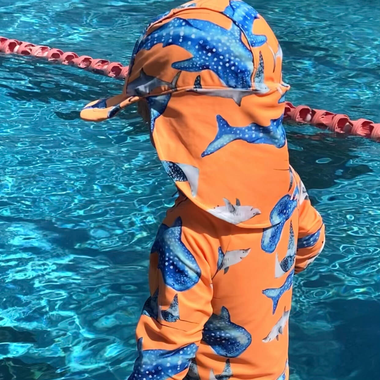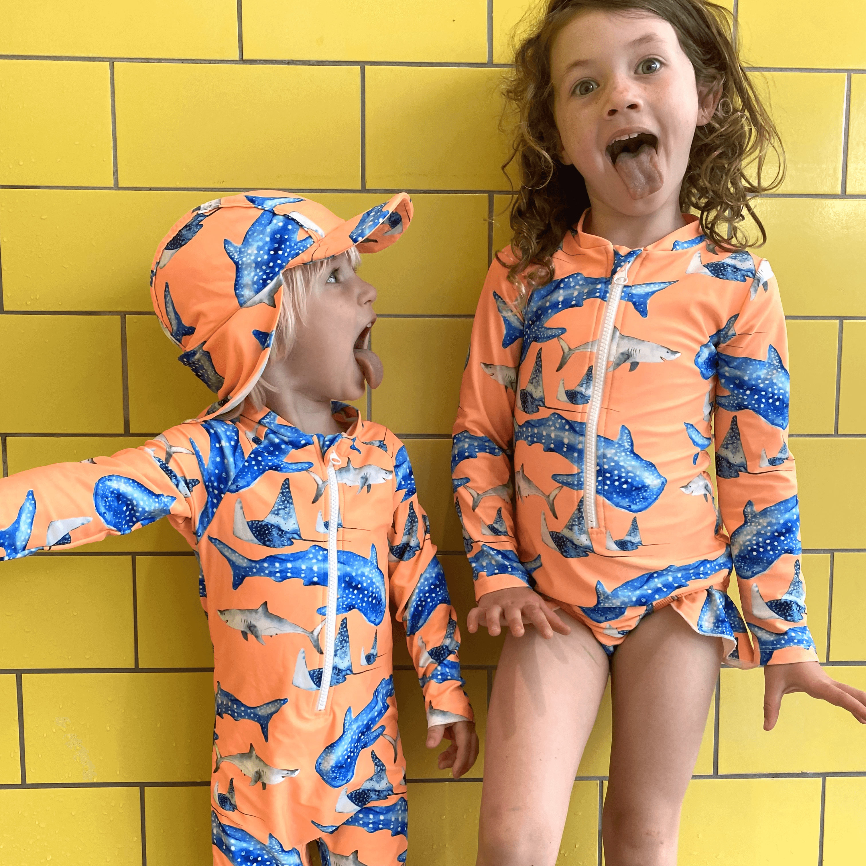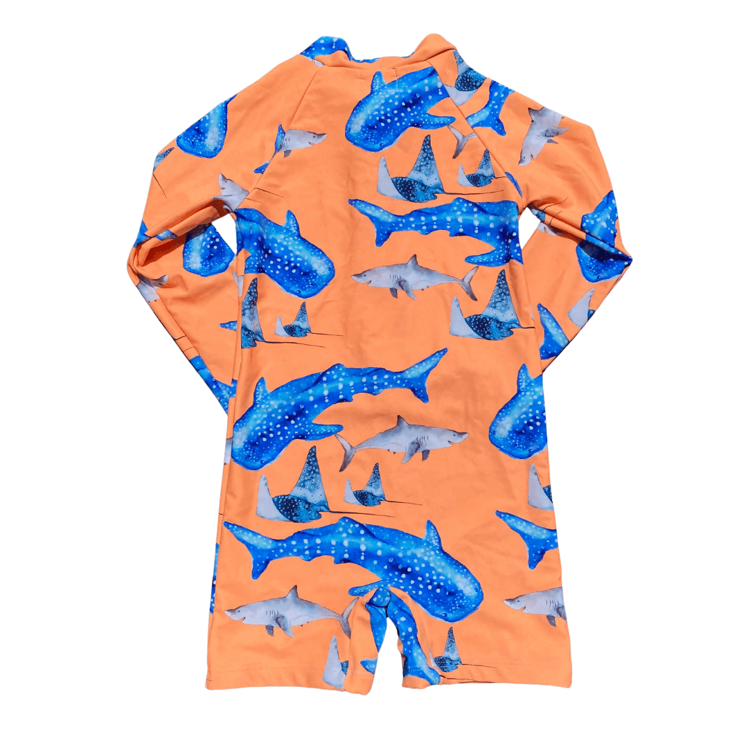 Featured here in our best selling Unisex Long Sleeve Zip Swimmers, our newest, limited edition Fluro Orange Sharks print is the perfect swimsuit for boys and girls alike!
